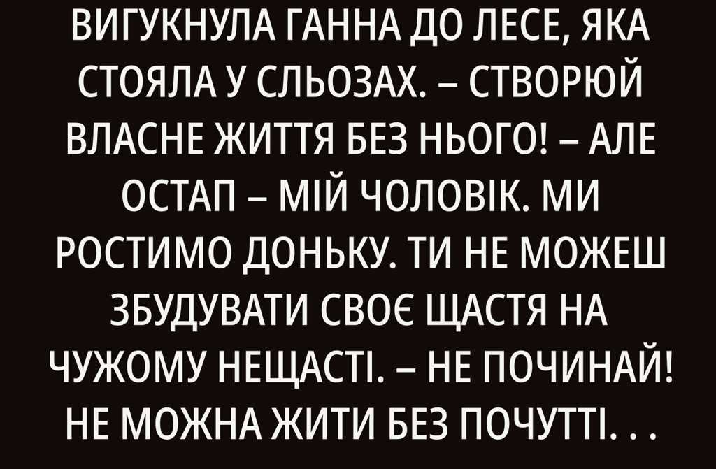 Але Остап мій чоловік. Ми ростимо доньку. Ти не можеш збудувати своє щастя на чужому нещасті.