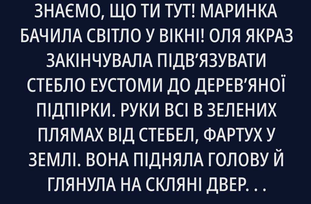 Після їхнього відходу Оля довго сиділа на тому ж табуреті. Дивилася на свої квіти. Еустома у відрі, ніжно-рожева, з бутонами, як листи. Хризантеми у деревяних ящиках. Гілки фізалісу з помаранчевими ліхтариками. Вона сама робила це місце. Взяла приміщення через три місяці після того, як Віктор пішов. Ремонт, фарбувала стіни біло-сірим, шафки кріпив сусід Богдан Сергійович за пляшку доброго вина. Назву придумала «Стеблинка» ніби жартома, та прижилася. Знайшла постачальників, завела сторінку в інтернеті, вчилася фотографувати квіти, щоб вразити людей.