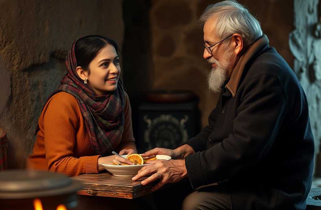 Побачивши на подвірї неохайного старого, вона зупинилася, здивована та налякана. Невідомий розпалив невеличке багаття й грів воду у брудній консервній банці.