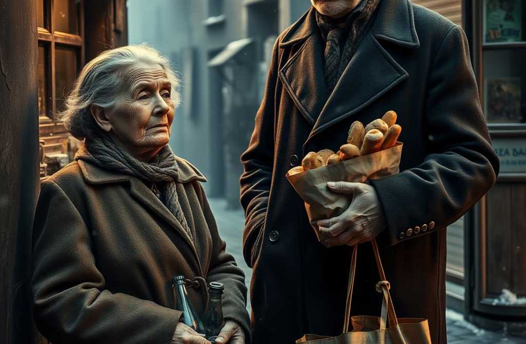 Серед сірих стін і облуплених вивісок стояла літня жінка, обличчя якої було вкрите сіткою тонких зморшок — кожна з них розповідала історію болю, стійкості та втрачених надій. У руках вона міцно стискала потерту торбинку, наповнену порожніми пляшками, як останні уламки минулого життя. Її очі були вогкі, а сльози повільно котилися по щоках, ніби не поспішаючи зникнути в холодному повітрі.