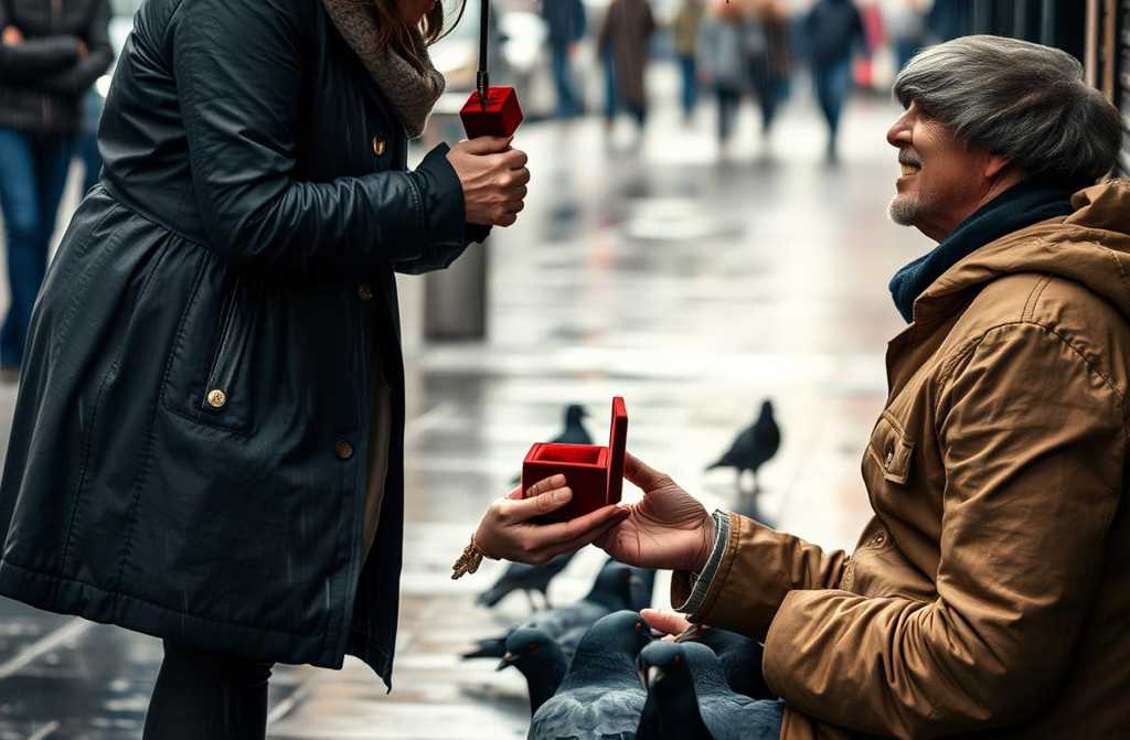 Небо мрячило ніжно, як шовкова завіса дощу, коли люди йшли повз із розкритими парасольками, опустивши очі. Але ніхто не звернув уваги на жінку у бежевому костюмі, яка посеред перехрестя впала на коліна. Її голос тремтів. «Будь ласка одружись на мені», прошепотіла вона, тримаючи оксамитову коробочку. Чоловік, до якого вона зверталася? Неголений тижнями, у пальті, залатаному скотчем, він спав у провулку за кілька кварталів від Хрещатика.