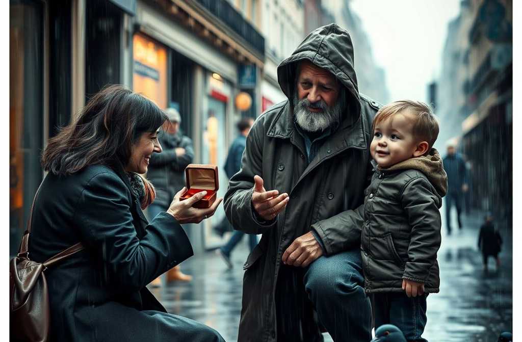 Небо проливало дрібний дощик, ніби тонка завіса, коли люди з розкритими парасольками й опущеними очима поспішали своїми шляхами. Ніхто не звернув уваги на жінку в бежевому костюмі, яка посеред перехрестя опустилася на коліна. Її голос тремтів. «Будь ласка одружися зі мною», прошепотіла вона, тримаючи оксамитову коробочку. Чоловік, до якого вона зверталася? Небрийтий, у пальті, латаному скотчем, він жив у глухому провулку за кілька кроків від Хрещатика.