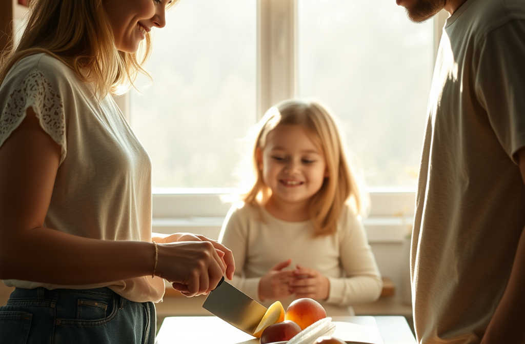 Соломія викладає скибочки на тарілочку і тільки тоді дивиться на брата.