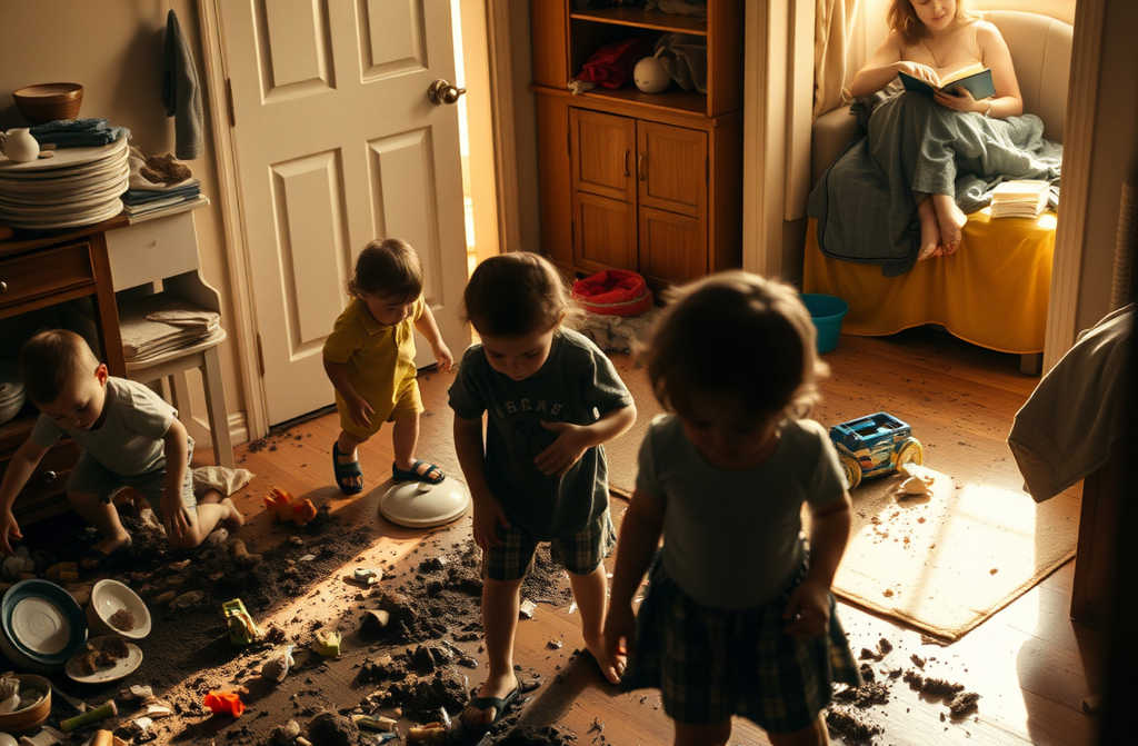 Він зробив кілька кроків і зупинився як вкопаний. Двір, зазвичай охайний, тепер нагадував поле битви. Його троє дітей восьмирічний Андрій, шестирічна Софійка та чотирирічний маленький Данилко гралися у калюжах, всі в бруді та ще в піжамах. Порожні коробки від їжі та обгортки лежали скрізь, ніби тут пройшов невеличкий торнадо.
