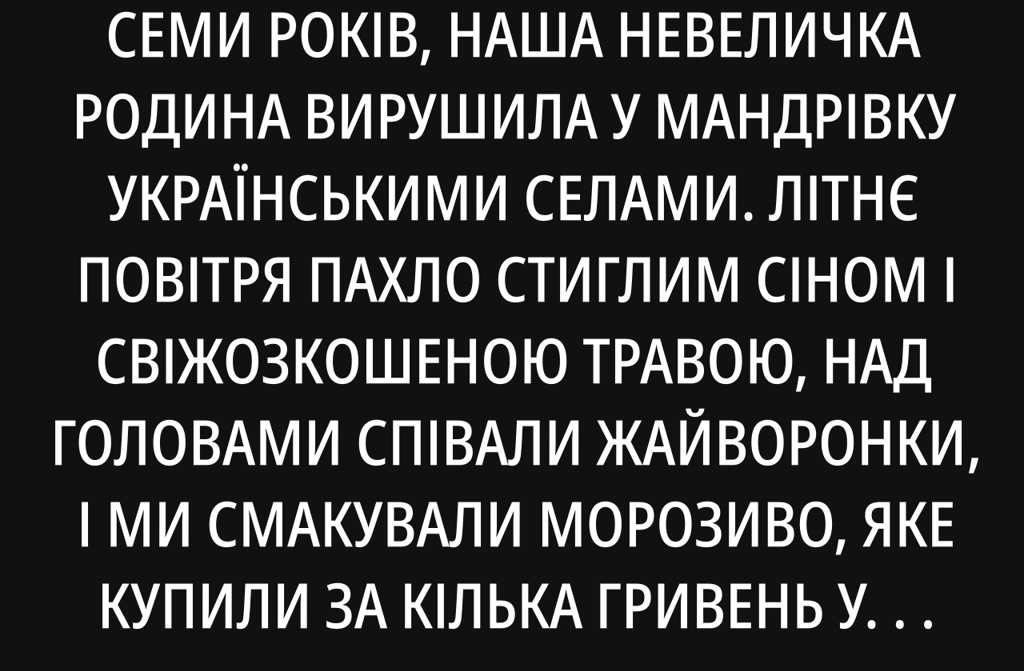 Машина зупинилась як уві сні: різко і без жодного звуку. Я вийшла, ніби крізь молочний туман, відкрила багажник і дістала запашні пакети для сміття, які завжди везла з собою куди б не їхала Україною. Голос мій звучав ніби з іншого світу, коли покликала сина вийти надвір: «Олеже, ходи сюди». Я сказала йому, що потрібно знайти ту саму обгортку, а ще зібрати усе сміття, що залишили інші мандрівники на узбіччі. Дружина моя, Катерина, хотіла втрутитись, але я спокійно попросила її: «Послухай краще “Океан Ельзи” в машині, я все владнаю».