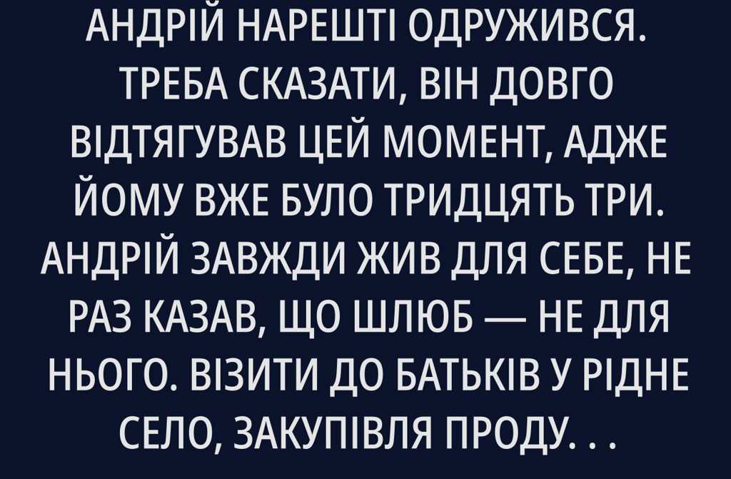 Яким би він не був певним у собі, Андрій не міг пригадати, щоб колись пропонував шлюб. Відхреститися не вдалось Мирослава спритно перевела розмову у русло підготовки весілля.
