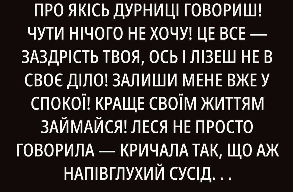 Леся не просто говорила кричала так, що аж напівглухий сусід Іван Андрійович, який копирсався біля свого гаража, обернувся, озирнувся і насторожився. Його цікавості вистачало лише на справді гучні події, тож тут Лесин зойк явно був не в межах норми.