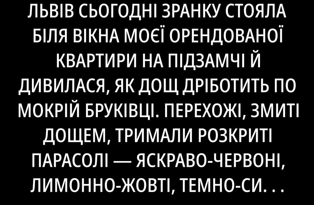 Сьогодні зранку стояла біля вікна моєї орендованої квартири на Підзамчі й дивилася, як дощ дріботить по мокрій бруківці. Перехожі, змиті дощем, тримали розкриті парасолі яскраво-червоні, лимонно-жовті, темно-сині наче шматки барвистого веретена, що пливуть асфальтовою течією. Дощ затягнувся вже третій день, і настрій мій був такий самий важкий наче ніхто й не скаже, що я щаслива. У руці холодів кухоль з чаєм. Апельсинова шкірка давно вивітрилась, залишився хіба гіркуватий присмак.
