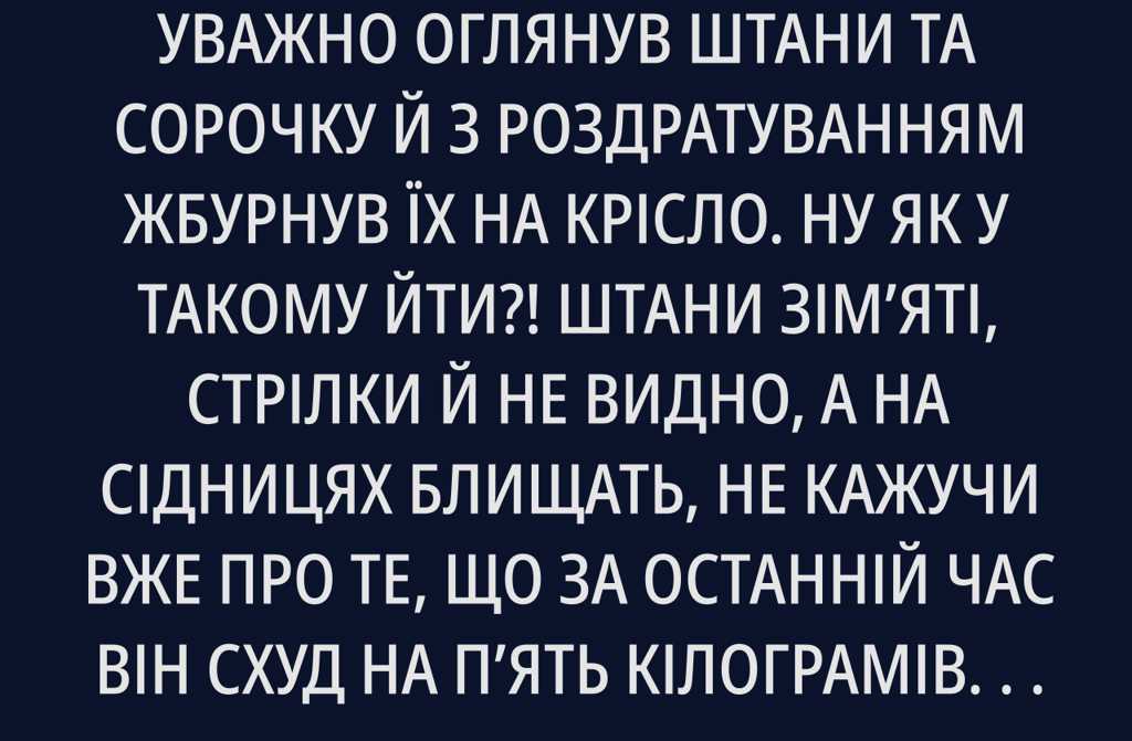 Ну як у такому йти?! Штани зімяті, стрілки й не видно, а на сідницях блищать, не кажучи вже про те, що за останній час він схуд на пять кілограмівтепер штани звисають, як мішок. Про сорочку й казати нічого: із голубої вона стала якогось мишачого кольору, манжети обтрепалися, комір вже без жодної жорсткостіганьба! Лідочка й у сільський магазин не пустила б у такій, а він у ній у Київському університеті професорський курс веде!