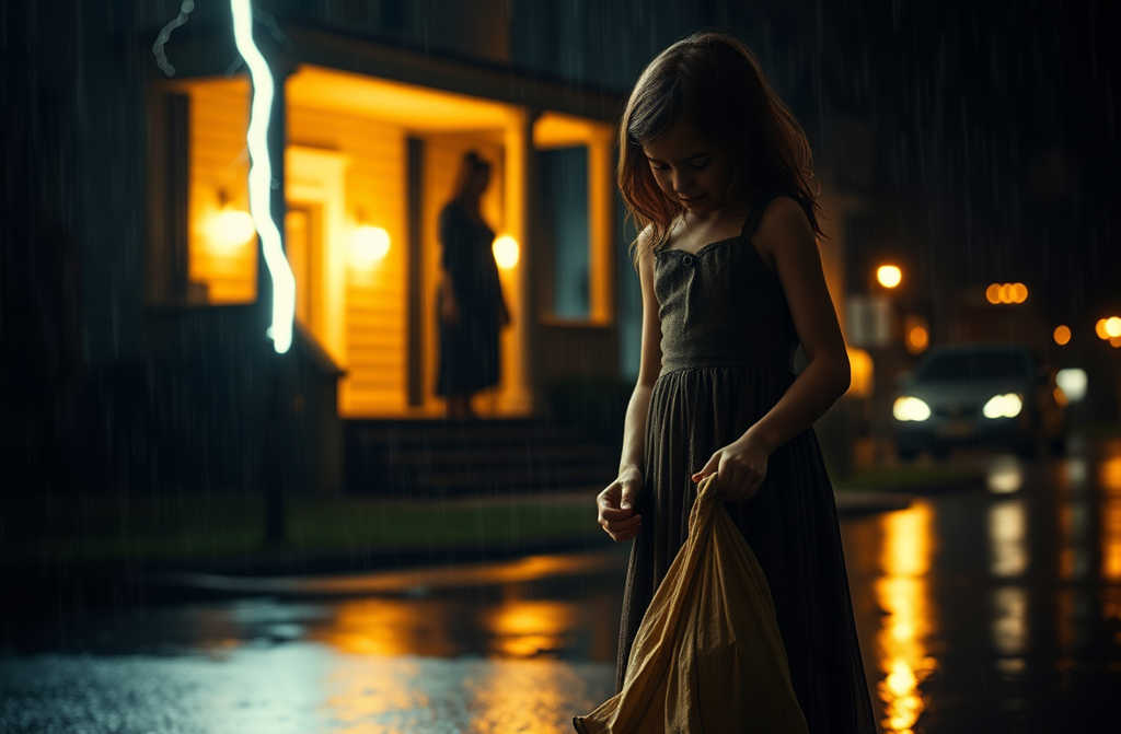 Позаду лунає голос Віри, крокуючої по мокрій доріжці: «Виходь! Я не годуватиму кволу паразиту». Блискає блискавка, спалахує силует і виблискуючі краплі, а маленька фігура намагається пройти по слизькому тротуару. Немає даху, немає мами, залишилася лише крихка віра, що Бог все ще спостерігає. Поруч зламаєте дзеркало, кров змішується з дощем на коліні. У тремтючих руках мокрий малюнок сукні, вшитий золотими лініями.