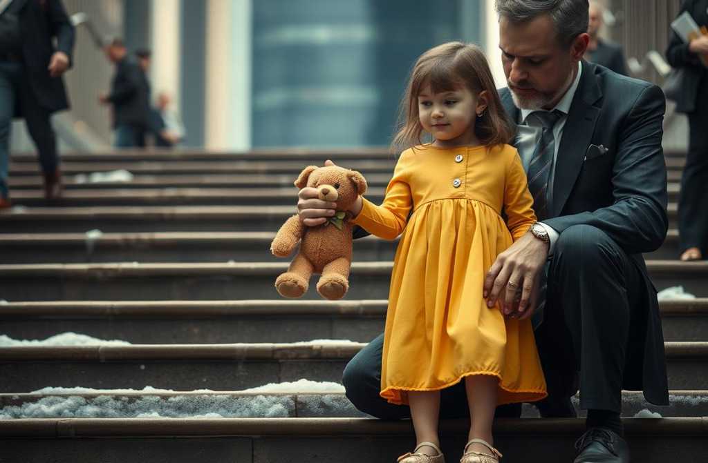 Там, біля підніжжя хмарочоса, сиділа маленька дівчинка. Їй не могло бути більше шести чи семи років. На ній була проста, трохи вицвітла жовта сукня, коліна підтягнуті до грудей, а під нею тонка блакитна ковдра, розстелена акуратно на холодних бетонних сходах. Перед нею, уважно вишикувані, лежали пять іграшок: потертий плюшевий ведмедик, пластиковий динозавр, лялька з рожевим волоссям, заплутаним у косиці, та дві саморобні фігурки, які нагадували незрозумілі створіння.
