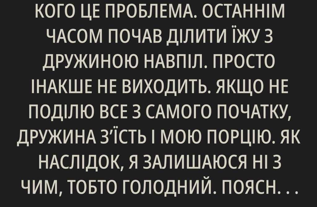 Не знаю, може, я один такий, у кого це проблема. Останнім часом почав ділити їжу з дружиною навпіл. Просто інакше не виходить. Якщо не поділю все з самого початку, дружина зїсть і мою порцію. Як наслідок, я залишаюся ні з чим, тобто голодний.