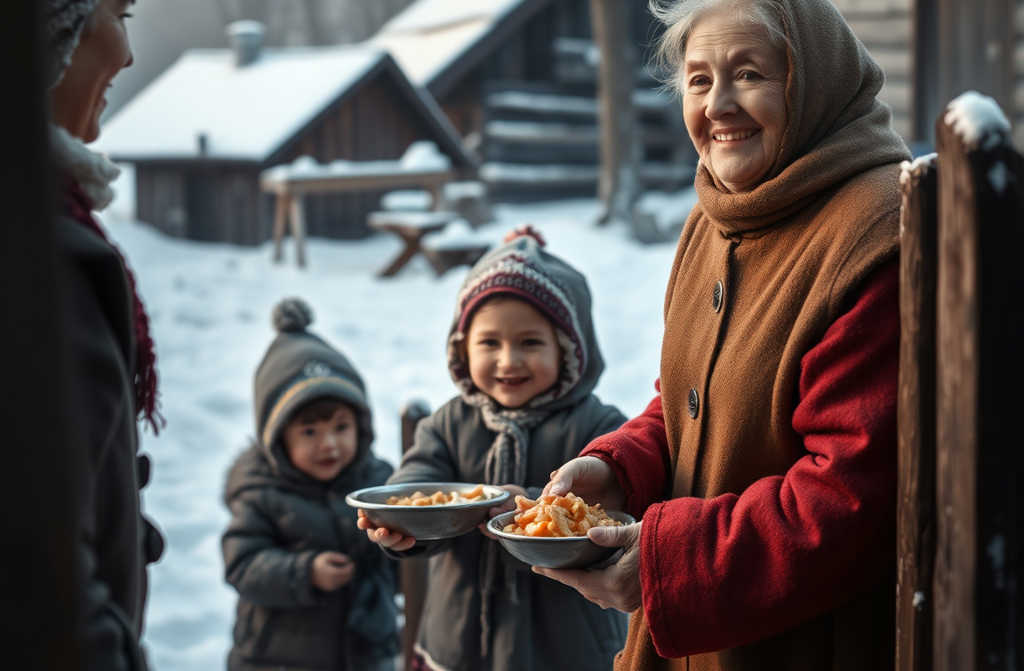 Коли батьки повернулися увечері, змучені й закоцюрблі, застали своїх дітей ситими та усміхненими. Мама тихо плакала, а тато зняв шапку, перехрестився і подякував Богові.