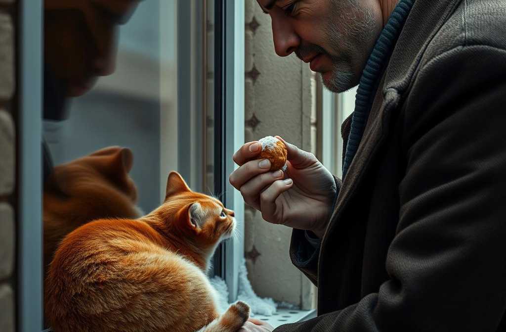 Навпаки: потайки кидати за вікно шматок мяса, котлету, ковбаску. Кіт їв. Одного дня чоловік підбіг до скляної панелі, і рудий, трохи дряпаючи, підняв лапу, притулив її до скла і мяукнув.
