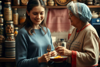 Я спустилась, ще в піжамі, з розтріпаним волоссям. Вона стояла біля плити у своєму улюбленому фартусі з персиками, який я їй подарувала ще у школі. Вона усміхалась, щоки рум’яні від духовки.— Мамо, дай хоч кави випити, — заблагала я.
