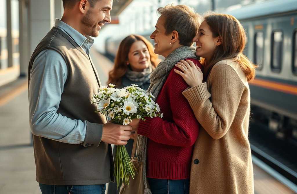 Вокзал. Одарка швидко попрощалася, поцілувала його в щічку, розмахнула рукою до зустрічної сімї, де стояв статний чоловік з двома хлопцями і великий букет білих хризантем. Вона підбігла, поцілувала чоловіка та дітей, обернулася, спіймала поглядом Олексія і прошепотіла: