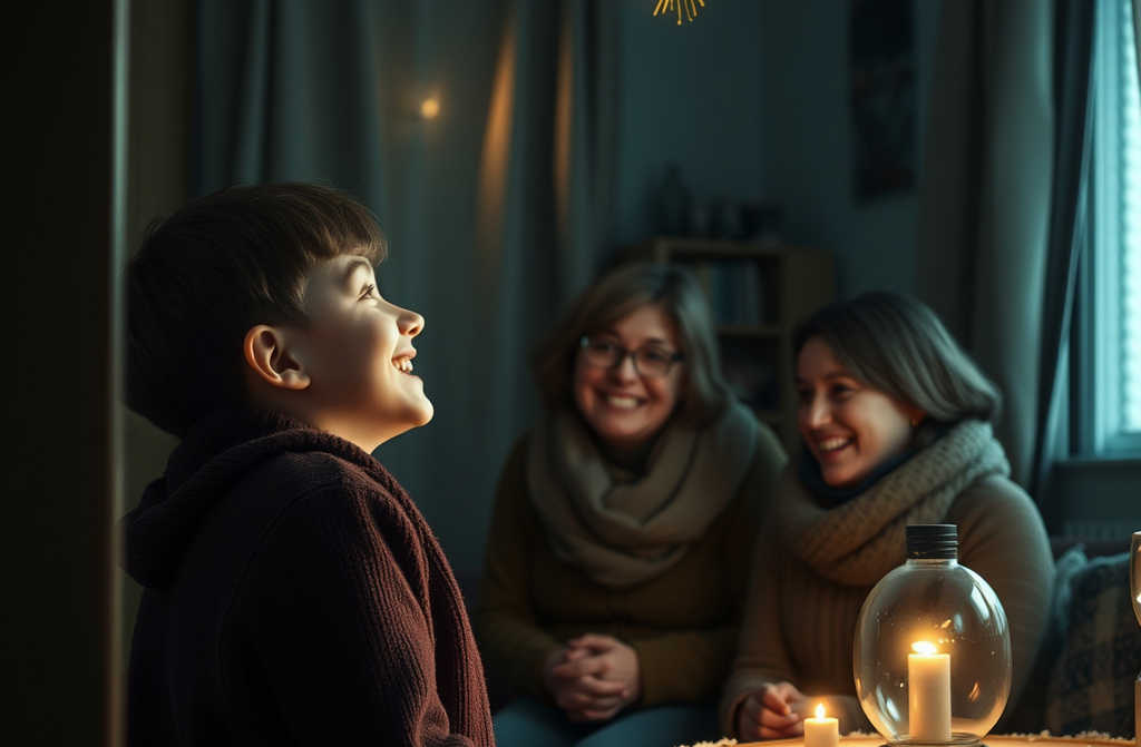 Він взяв мене за руку і повів до скромно вмебльованої кімнатки замість ялинки на журнальному столику стояла трилітрова банка, в якій хвоїнка, прикрашена маленькими іграшками і гірляндою.