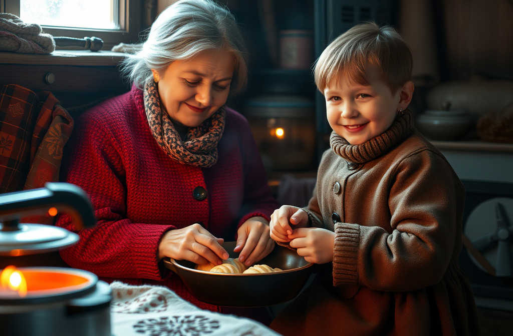 У хаті тепло, груба аж червона, чистенький Василько, щоки наче яблука, лежить на дивані, слухає патефон: Казка про Колобка. А немічна бабуся аж літає: деко маслом змащує, тісто місить, яйця до сиру б’є. Ноги ніби омолодились.