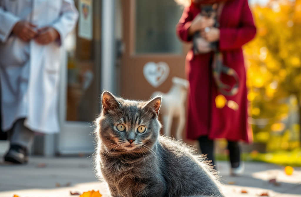 Біля дверей ветеринарної клініки сиділа сіра кішка. Вона плакала, а біля її лап лежав крихітний кошеня