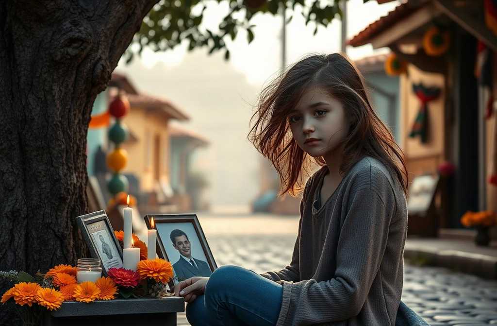 З тим небагатим, що встигла схопити, виганяючи її — зокрема, з батьковою світлиною — вона вирішила зробити свій власний алтар. Зібрала квітів біля дороги, знайшла трохи черствого хліба та сухофруктів — і влаштувала спомин у затишному куточку під старим дубом. Впала навколішки перед світлиною та розплакалася.