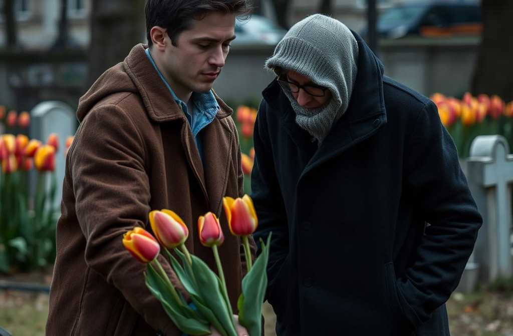 Таксі зупинилося біля брами кладовища. Хлопець, що вийшов, підійшов до жінки, яка торгувала квітами: