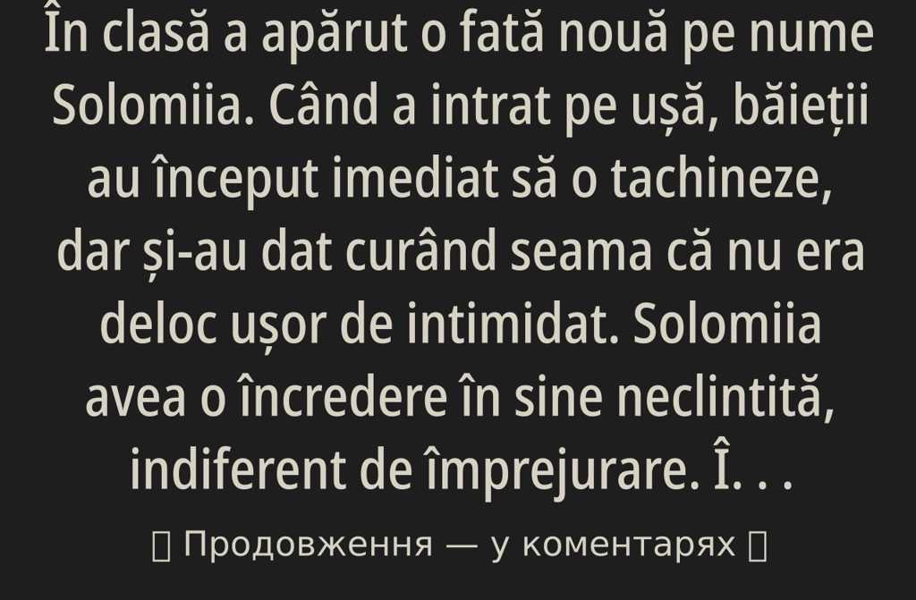 Când s-a reîntors la școală, băieții au fost foarte uimiți de schimbare. Dintr-odată, toți voiau să fie prieteni cu ea. Dar Solomiia s-a apropiat cu un zâmbet larg de băiatul care o tachinase și l-a întrebat jocăuș dacă are nevoie de ajutor să inventeze glume noi.