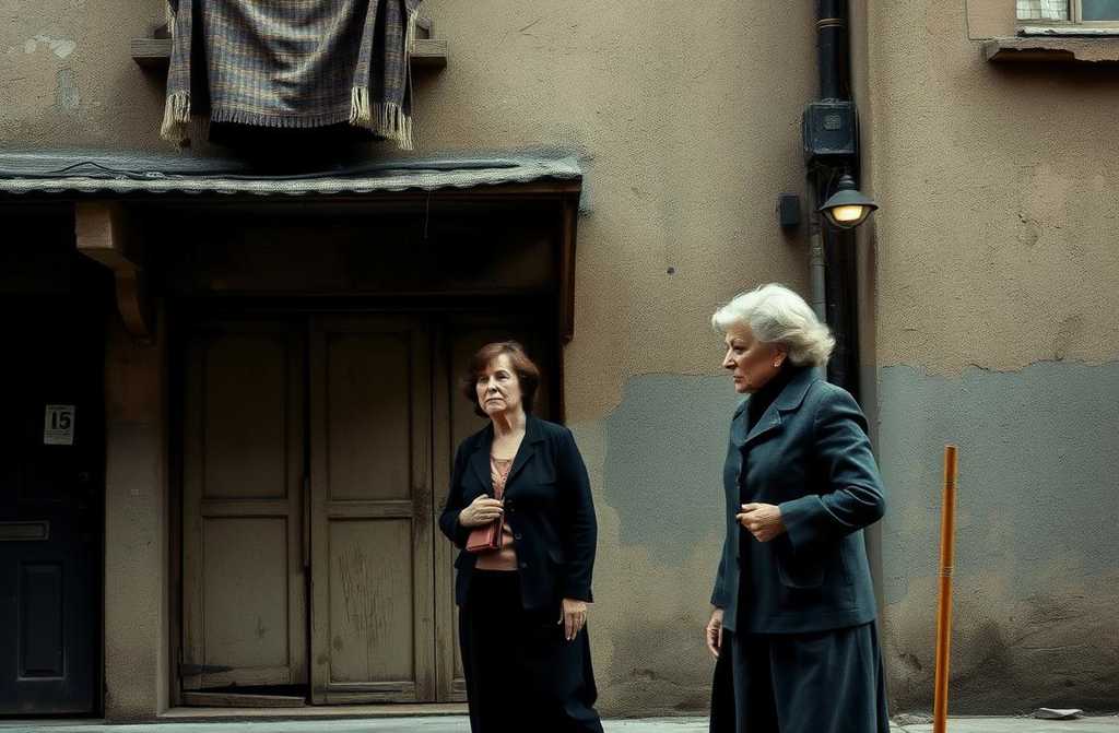 У старому занедбаному будинку повненька жінка вибивала килим із вітряка, не помічаючи, що пил сипався на худу сусідку знизу.
