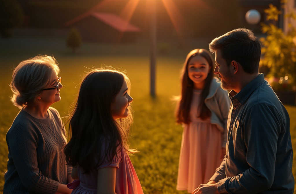 Світлом освітлюються галявина, предмет і люди, що виходять з кутка будинку. Це його сини з дружинами, внуками, кілька родичів, а також Оленка в супроводі довгого чоловіка в окулярах з товстими лінзами. У всіх в руках шарики, вони дують у трубочки й натискають кнопки, що випускають звукові балончики. Вони одночасно кричать, махають руками і обіймають його: