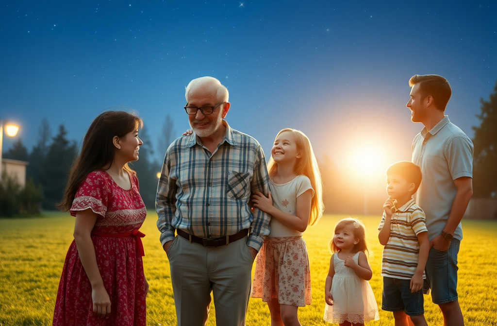 Що це таке?! вигукнув він, і в цей момент… Відразу спалахи кількох прожекторів! Вони освітлили галявину, предмет і людей, що зявилися з кутка хати. Ось його синовичі з дружинами і онуками, кілька їхніх родичів. А ще Зоряна в супроводі довгого чоловіка в окулярах з товстими лінзами. У всіх в руках були повітряні кульки, вони дули в трубочки, а деякі натискали кнопки яскравих балончиків з стисненим повітрям. Усі одночасно кричали, махали руками і кидалися обіймати його: