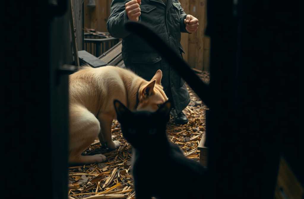 Киця блискавично сховалася… прямо за Лаймом. Пес спочатку спантеличився, а тоді увімкнув серйозний погляд оскалився, настовбурчив холку, дивився суворо.