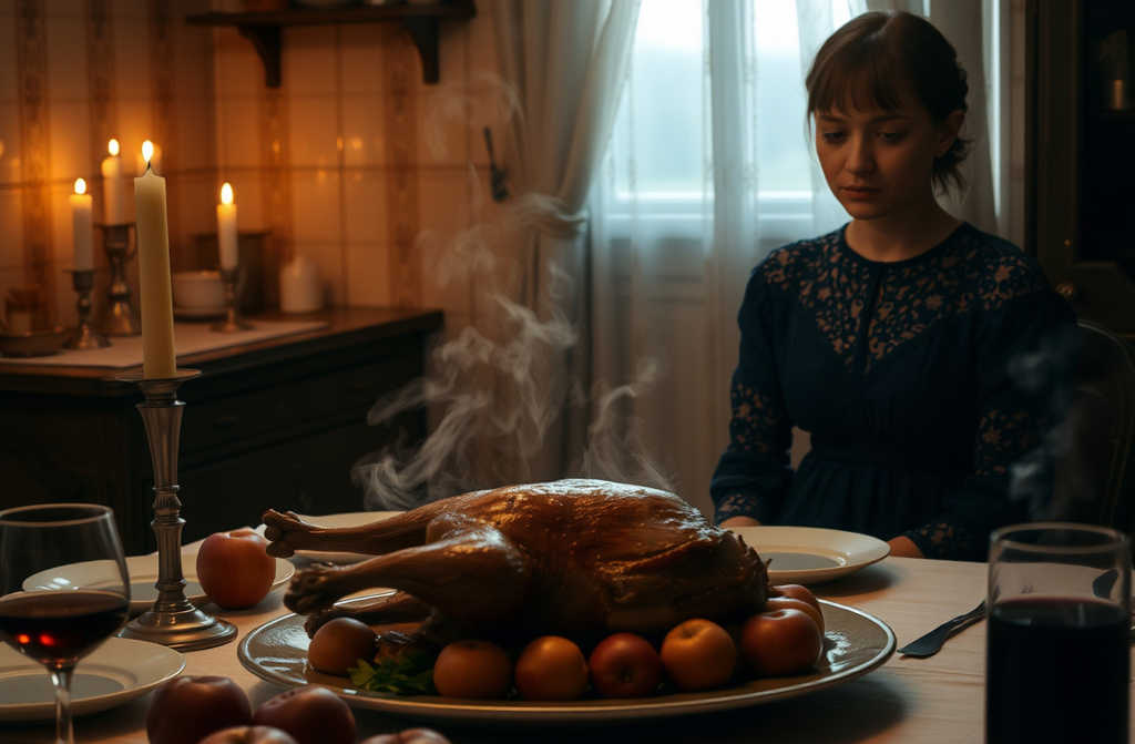 «Постав вино й келихи», сказала Олена, але голос їй тріпотів. Вона знову подивилася на годинник 20:30. Качка вистигала, соус густів, а свічки догоряли, роняючи віск на серветку.