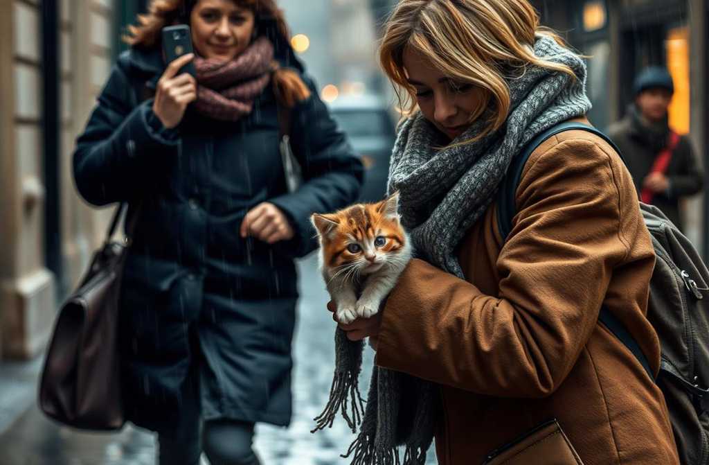 Сумніви зникли залишити його вона не могла. Кошеня тремтіло, промокле наскрізь. Вона обережно завернула його у свою білу хустку й побігла ще швидше до автобуса. Вона вирішила взяти його з собою в офіс, а потім придумати, що робити далі. Її добрий сердечко не дозволило залишити цього сироту.