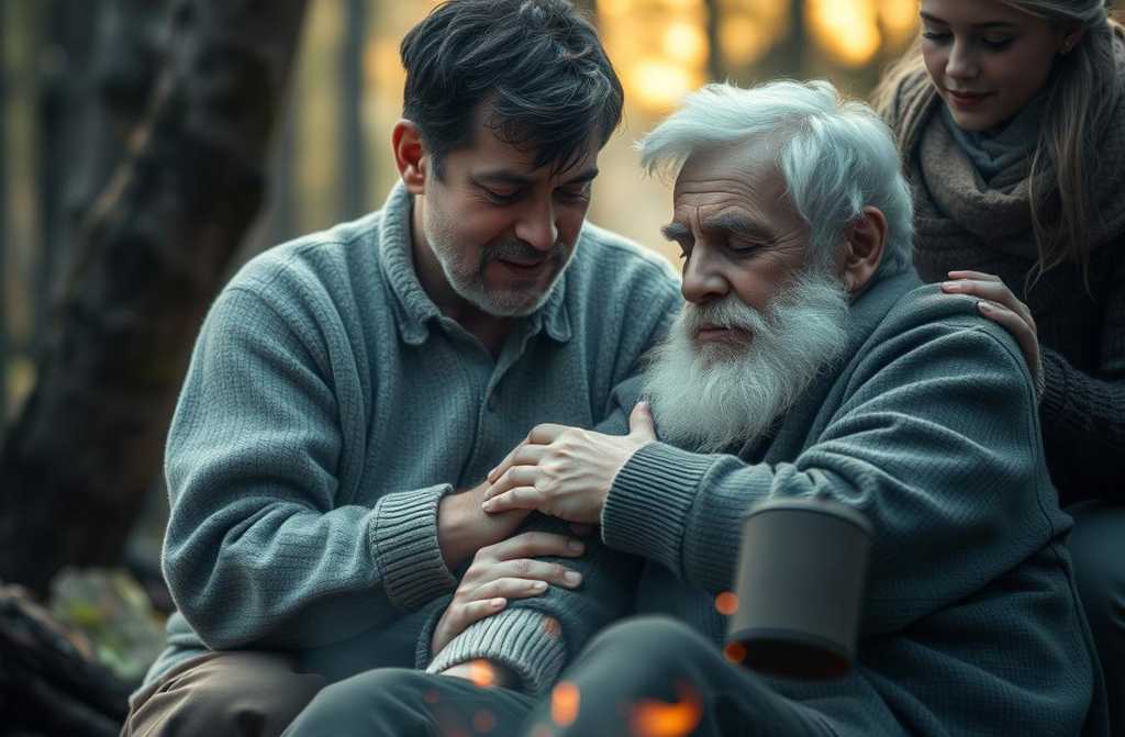 Засмучений хлопець, тримаючи на руках свою засмучену матір, дивився, як діда везуть на швидку допомогу.